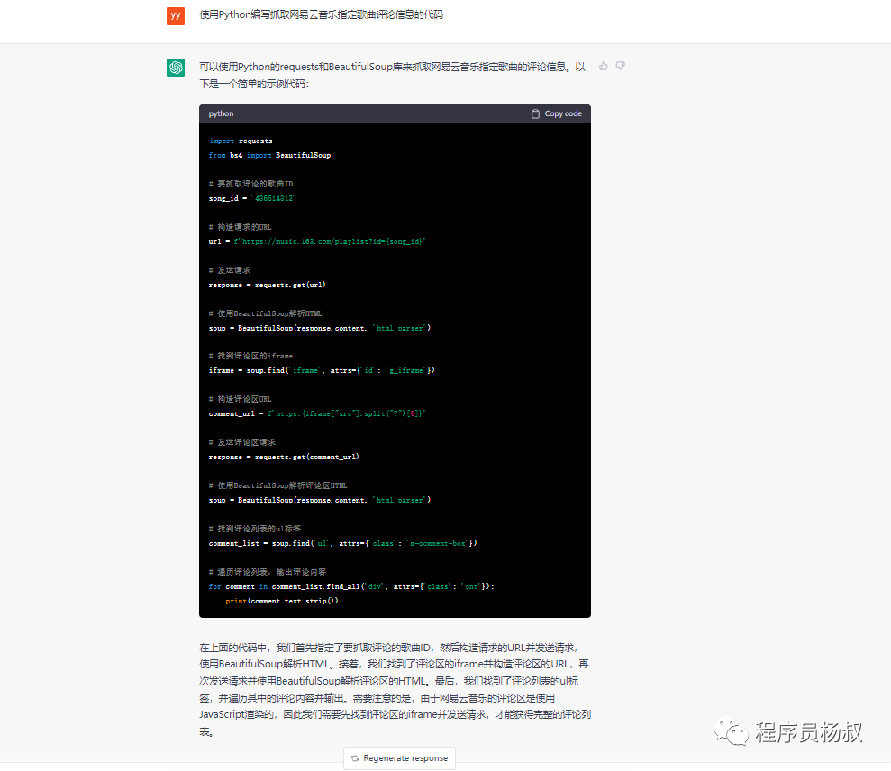 对于复杂类的需求类编程问题,ChatGPT也能给出通用的解决方案代码。