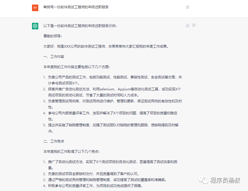 再进一步,大家是不是每到年底,写年终述职报告的时候头疼不已,总是埋怨自己的语文是体育老师教的?看看ChatGPT能给我们提供怎样的思路: