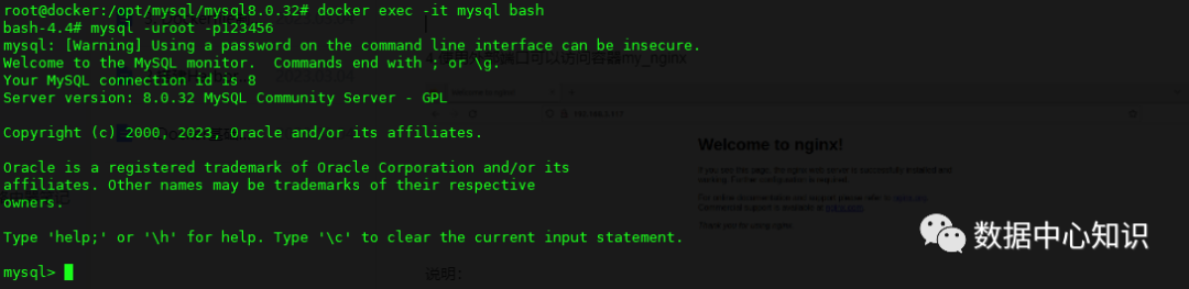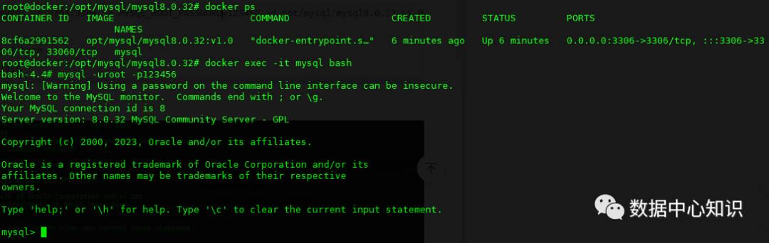 docker run --name mysql -p 3306:3306 -e MYSQL_ROOT_PASSWORD=123456 -d opt/mysql/mysql8.0.32:v1.0docker psdocker exec -it mysql bash mysql -uroot -p123456
