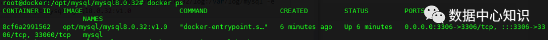测试opt/mysql/mysql8.0.32:v1.0可用;docker ps查看进程。