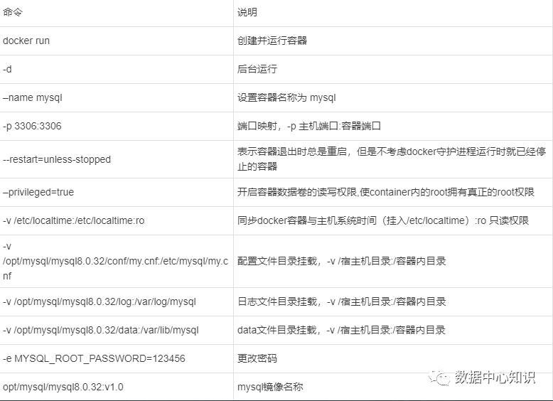 docker run --restart=unless-stopped -d --name mysql -p 3306:3306 --privileged=true -v etc/localtime:/etc/localtime:ro -v opt/mysql/mysql8.0.32/conf:/etc/mysql/conf.d -v /opt/mysql/mysql8.0.32/data:/var/lib/mysql -v /opt/mysql/mysql8.0.32/log:/var/log/mysql -e MYSQL_ROOT_PASSWORD=123456 opt/mysql/mysql8.0.32:v1.0