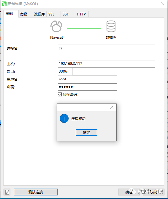 本地用Navicat工具连接数据库,192.168.3.117为宿主机IP,填入端口账户密码测试连接。