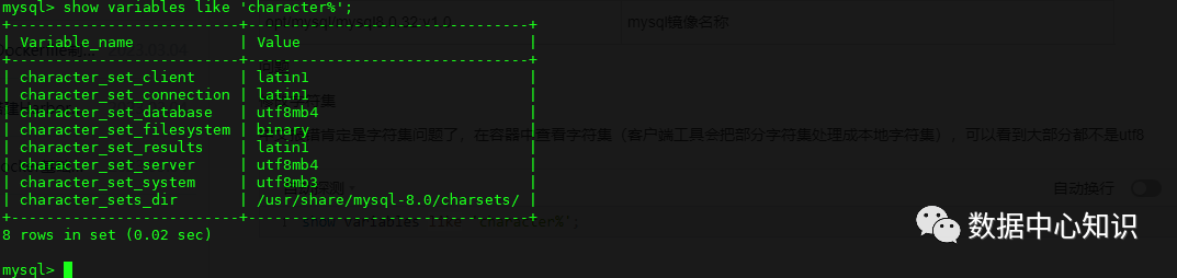 中文报错肯定是字符集问题了,在容器中查看字符集(客户端工具会把部分字符集处理成本地字符集),可以看到大部分都不是utf8