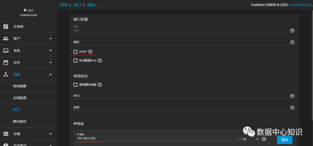 1.系统安装完,登录web管理页面,进行静态IP设置,编辑-DHCP(去掉对勾)填写静态IP