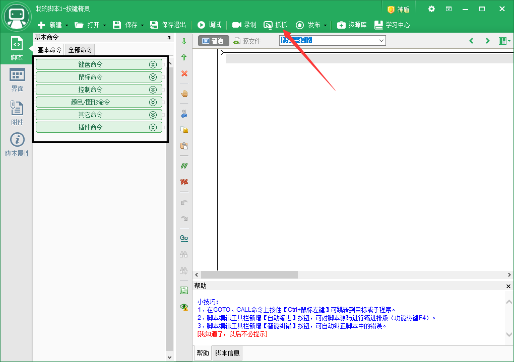 打开了新建脚本的窗口,我们先看下窗口上的内容。如下图,窗口左边将命令分成了几个类别,分别是【键盘命令】、【鼠标命令】、【控制命令】、【颜色/图形命令】、【其他命令】、【插件命令】。这些命令都用好了就成了编程高手了。本文中只需要用到两次鼠标移动和三次鼠标单击的【鼠标命令】,还有等待提示框和信息框打开延时等待的【其他命令】。