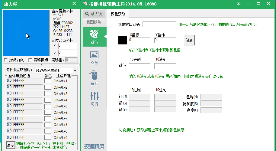 点击【抓抓】按钮后,会打开两个新的窗口,分别是【放大镜】窗口和【按键抓抓辅助工具】窗口。