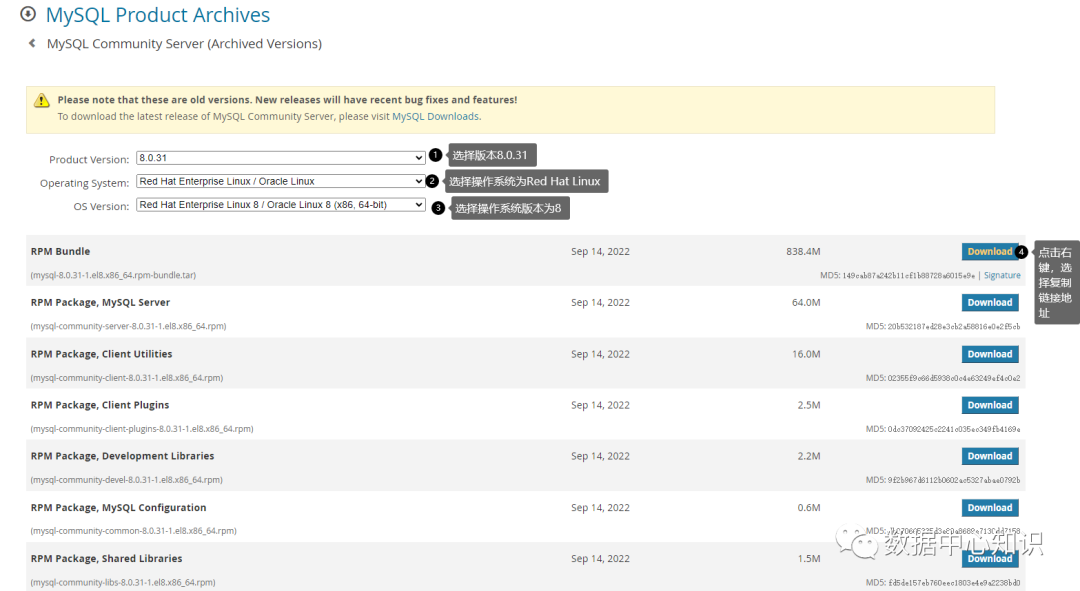 最终拿到的官网地址为:https://downloads.mysql.com/archives/get/p/23/file/mysql-8.0.31-1.el8.x86_64.rpm-bundle.tar
