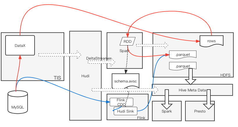通过在TIS平台中定义Hudi数据湖实例,可以选择由DeltaStreamer来执行数据批量导入Hudi表,或者由Flink Job来执行增量Hudi表数据同步任务。