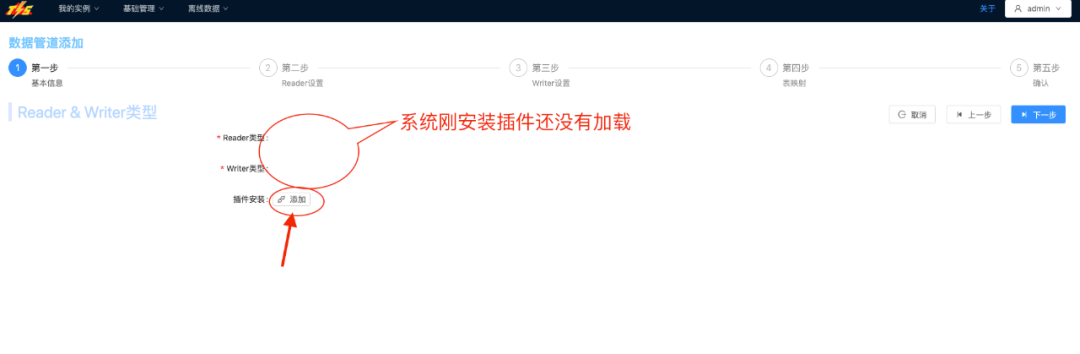4. 进入数据端选择步骤,选择Reader Writer类型选择,由于系统刚安装,数据端类型对应的插件还没有选取,需要点击插件安装