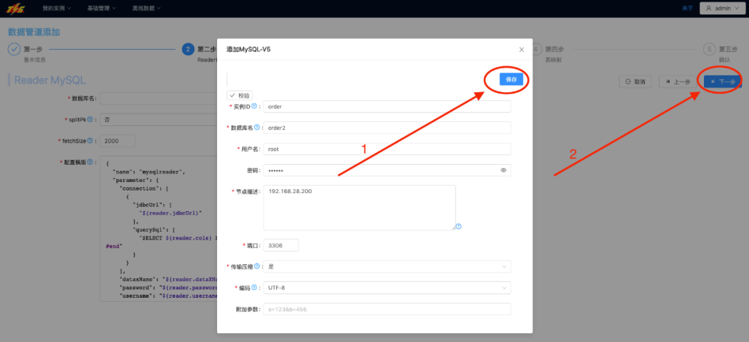 下拉框中MySqlV5 数据源,完成表单填写,点击保存