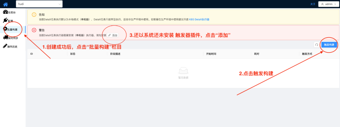 2. 由于TIS系统初次安装,还未安装触发器插件,请按照只是先安装,成功之后再触发批量导入