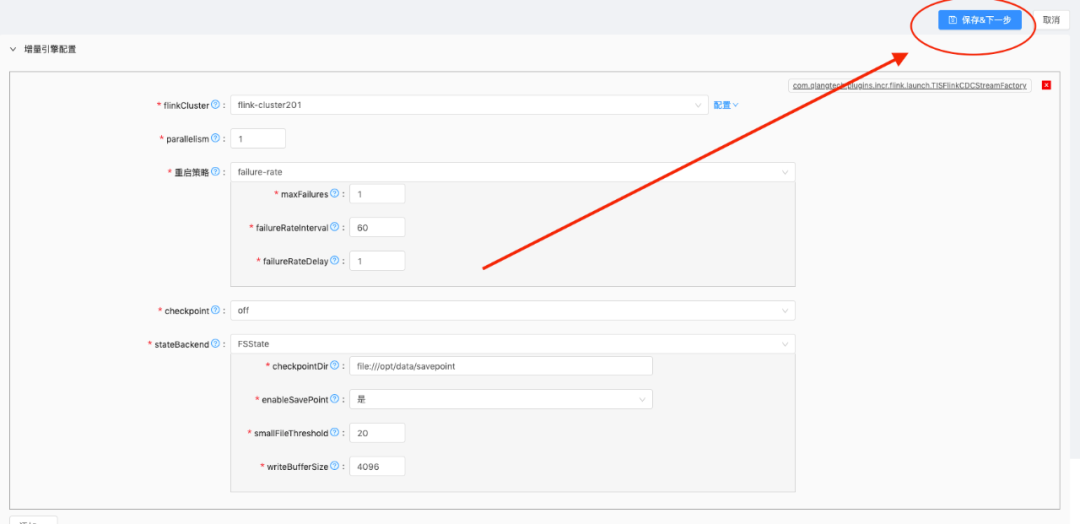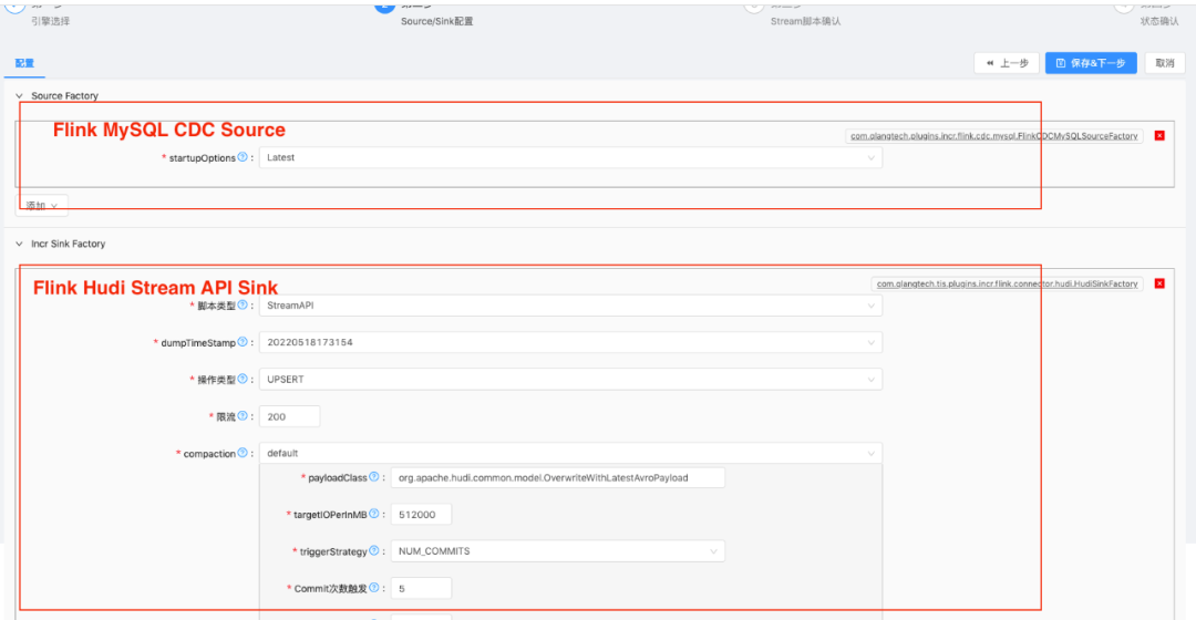 按钮进入下一步Sink,Source相关属性设置该步骤添加Flink SourceFunction对应的flink-connector-mysql-cdc[12]](https://github.com/ververica/flink-cdc-connectors/tree/master/flink-connector-mysql-cdc))插件 和 Fink Sink对应的Hudi 插件