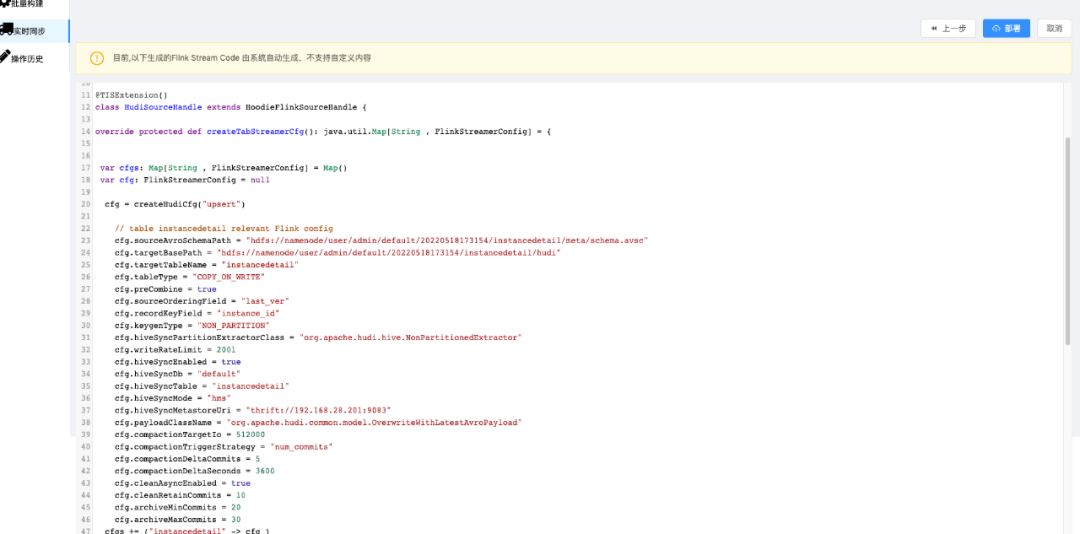 在该版本中,自动生成的Flink Stream Code还不支持用户自定义编写业务逻辑