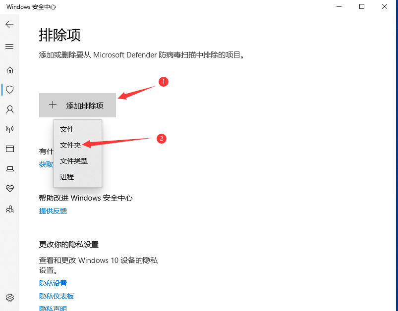 在排除项窗口里,顺序点击【添加排除项】---【文件夹】,选择刚刚安装程序显示的文件夹,点击确定,如下图:
