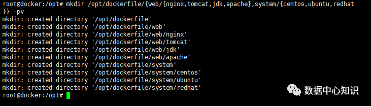 root@docker:/opt#mkdir opt/dockerfile/{web/{nginx,tomcat,jdk,apache},system/{centos,ubuntu,redhat}} -pv