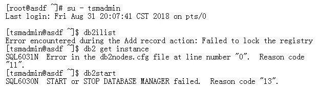 机异常关闭后,TSM server无法启动,检查后台的db2数据库无法启动。
