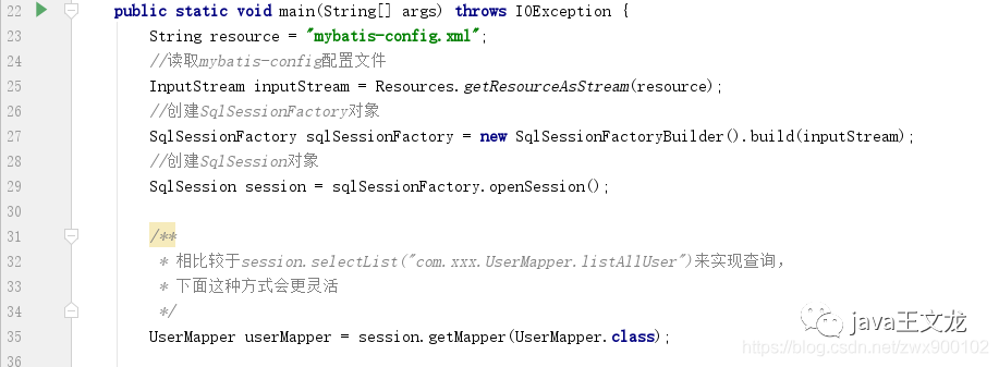 String resource = "mybatis-config.xml";InputStream inputStream = Resources.getResourceAsStream(resource);SqlSessionFactory sqlSessionFactory = new SqlSessionFactoryBuilder().build(inputStream);