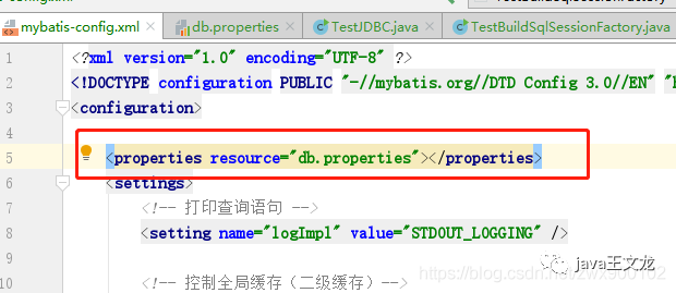 采用这种方式之后,mybatis-config.xml文件可以直接用${}来取值了。当然其实还有一种更简单的方式,那就是直接在mybatis-config.xml引入properties文件,这样就不用在代码中去解析properties文件了: