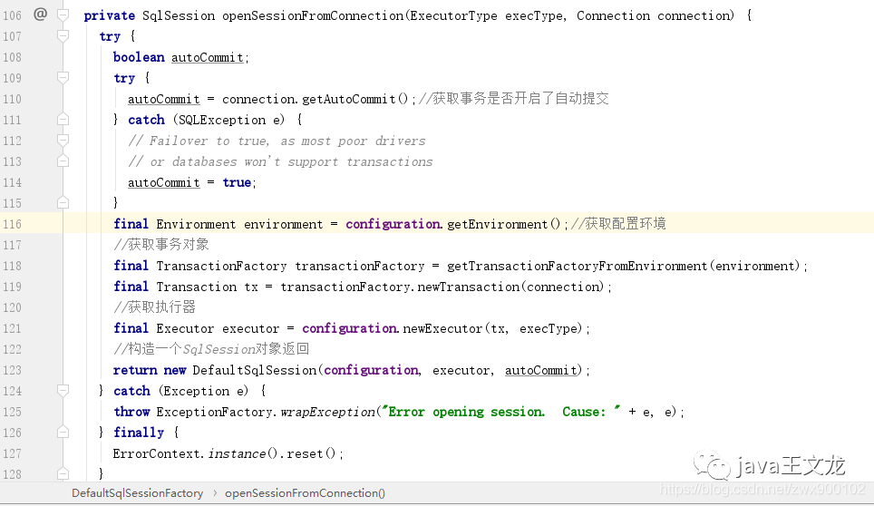 从上面的两个方法截图中很明显可以看到,这两个方法基本一样,唯一的区别是openSessionFromConnection方法是从Connection对象中获取当前会话是否需要开启自动提交。