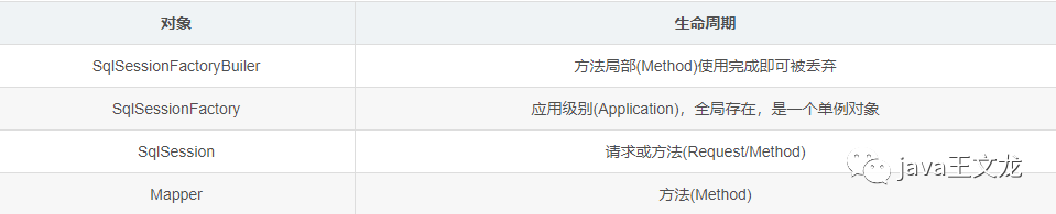 从这些步骤我们可以看到,MyBatic完成一次数据库操作主要有4大核心对象:SqlSessionFactoryBuiler,SqlSessionFactory,SqlSession和Mapper。