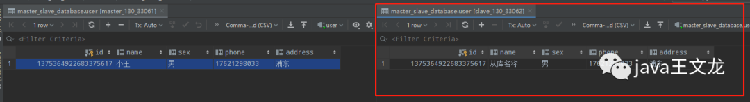 查询之前,我们把从库中刚新增的这条数据的name改个名,改成从库名称,因为从库的数据是从主库读来的,那我们调用查询接口的时候怎么才能知道查来的数据是主库的还是从库的