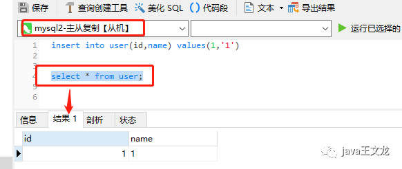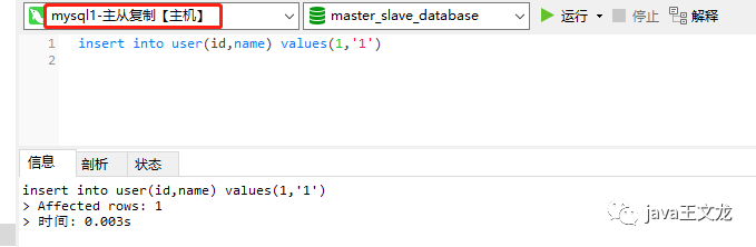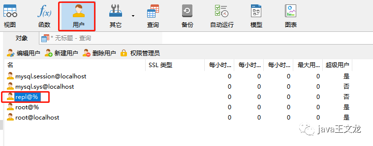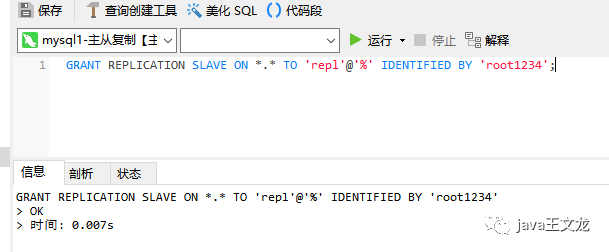 上面我创建了两个mysql,一个是mysql1,另一个是mysql2,那么我就把mysql1作为主机,mysql2作为从机,首先给主机重新分配一个用户,目的是为从机登录主机读取数据用的,操作如下: