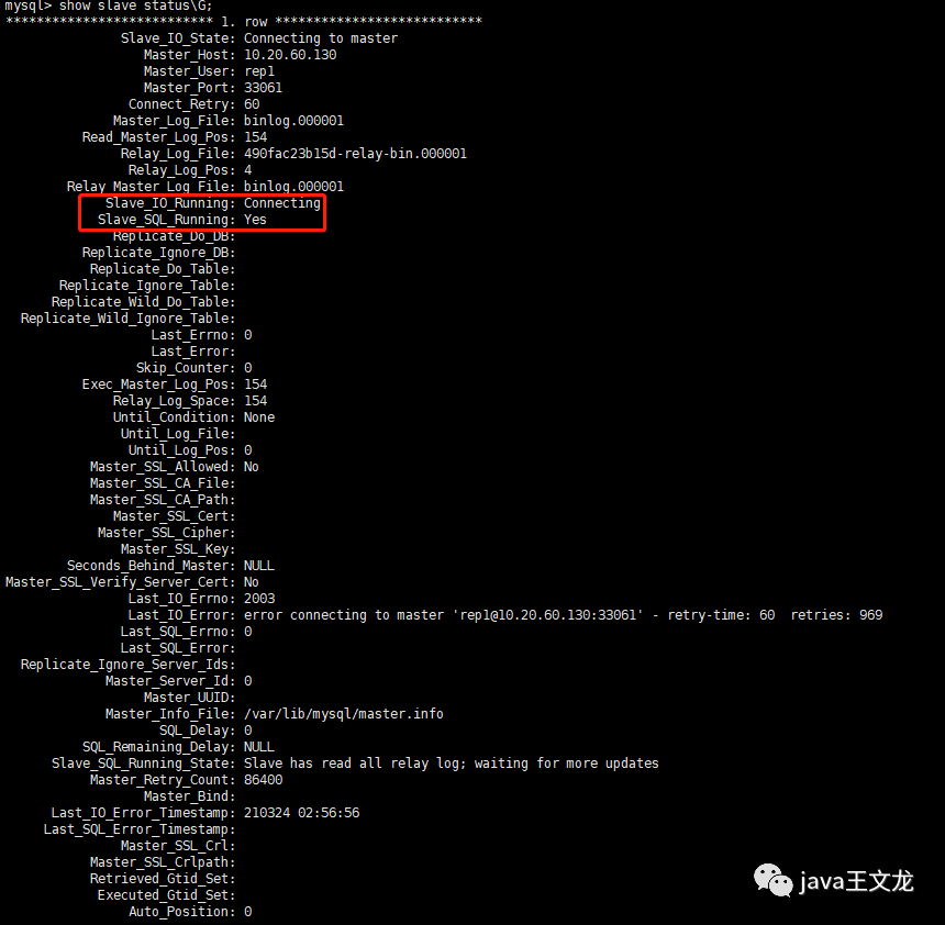 Last_IO_Error: error connecting to master 'rep1@10.20.60.130:33061' - retry-time: 60 retries: 969