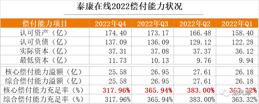 最近,泰康在线披露了其2022年4季度偿付能力报告。