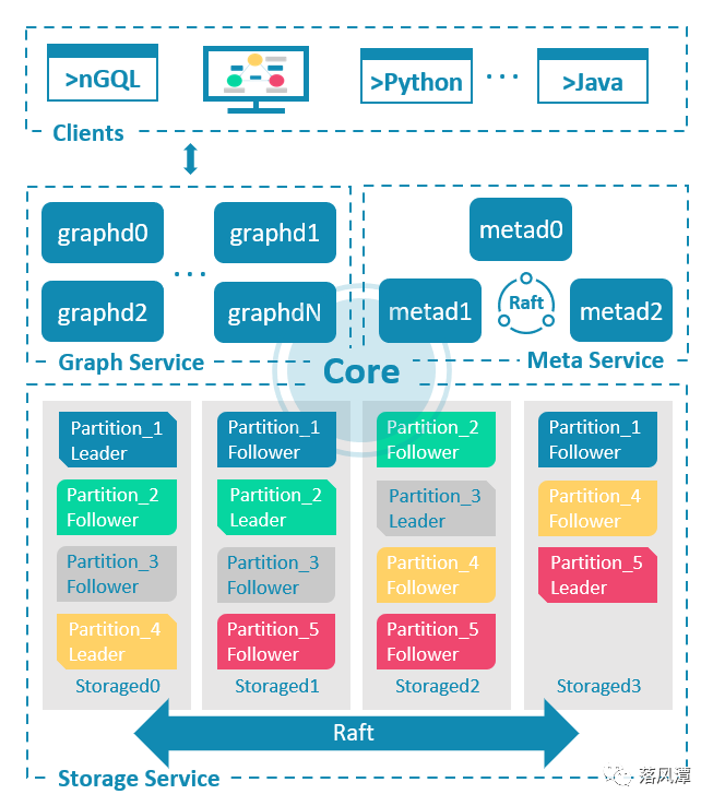 元数据的存储和管理,类似TiDB中的Placement Driver,对应nebula-metad进程,基于Raft协议组成集群,用于执行Schema操作、存储和管理数据信息分片信息、用户权限等集群管理工作。
