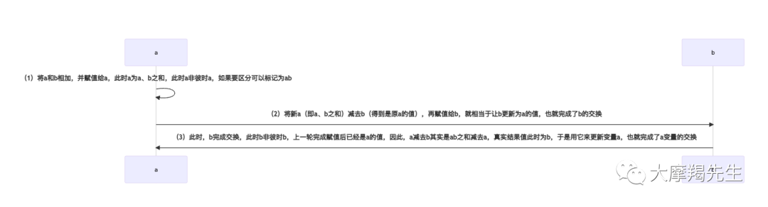 //(3)此时,b完成交换,此时b非彼时b,上一轮完成赋值后已经是a的值,因此,a减去b其实是ab之和减去a,真实结果值此时为b,于是用它来更新变量a,也就完成了a变量的交换