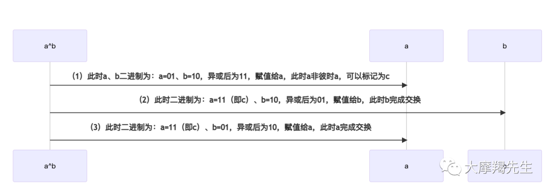 //(3)此时二进制为:a=11、b=01,异或后为10,赋值给a,此时a完成交换