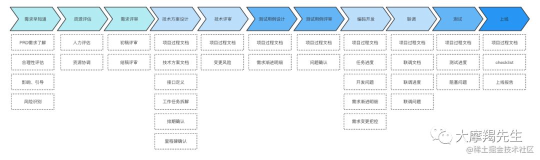 每个核心节点要进行交付对应输出物,主要有技术方案、项目过程文档、联调文档、测试报告、上线报告等。