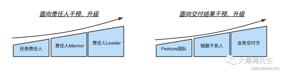 工作任务出现问题则按照Feature的最终交付关系逐层同步和升级,寻求Feature链路上参与各方的理解和方案,给予时间或资源支持。