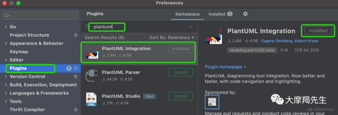 打开Goland,Preference -> Plugins -> Marketplace -> 搜索plantuml -> 安装