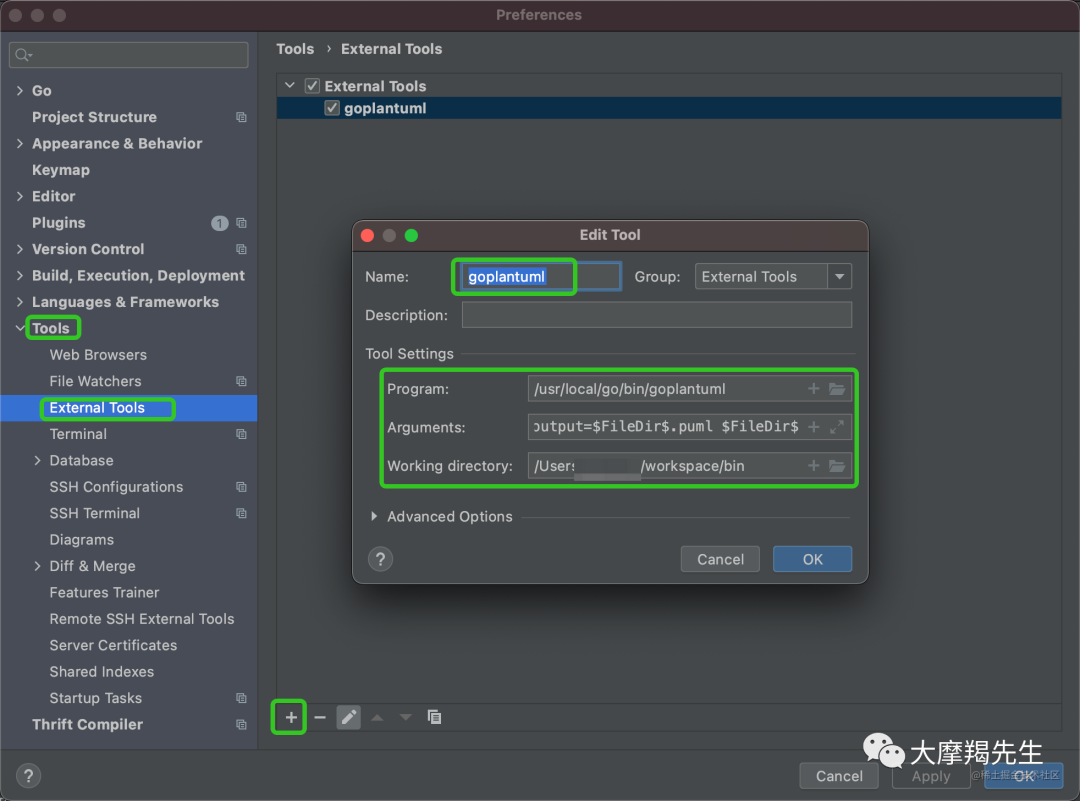 Name:goplantuml(可自定义) Program:/usr/local/go/bin/goplantuml (goplantuml的安装路径,可以通过$GOBIN获取到) Arguments:-recursive --output=.puml Working directory: /User/workspace/bin (Project目录路径)