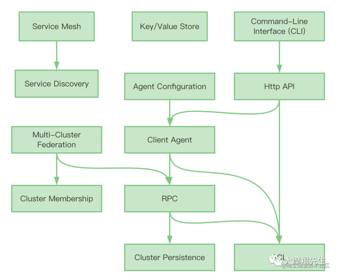 | Cluster Persistence | - 集群持久化子系统完全在服务器代理中运行。它处理来自RPC子系统的读和写请求。 - 有关 Consul部署体系结构和集群持久化子系统使用的共识协议的介绍,可以参阅 Consul体系结构指南。 - 这部分主要是基于 Raft共识协议实现 |