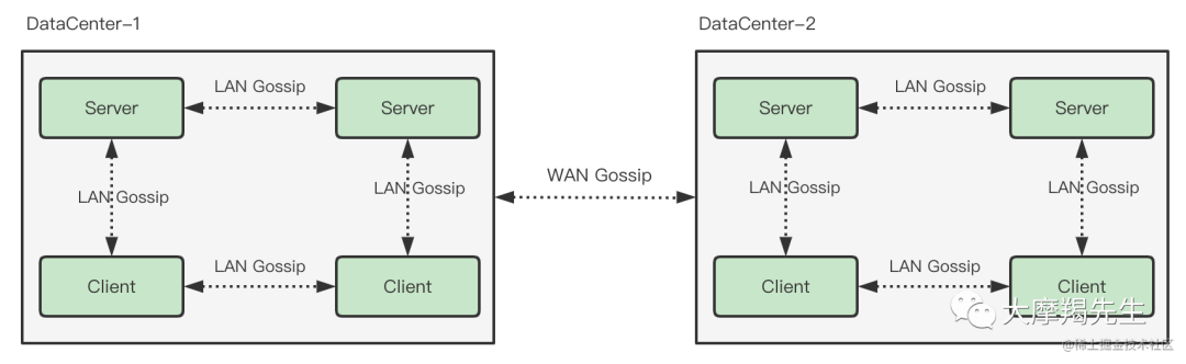 所在的每个数据中心都有一个包含数据中心所有成员(客户端和服务器)的LAN Gossip Pool