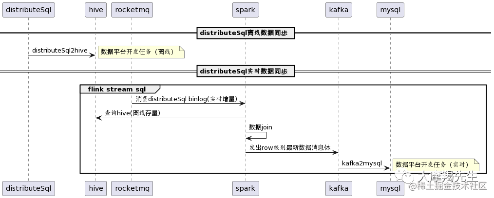 实时链路相对复杂一些,这里参考了之前搭建准实时数仓的方式,通过公司数据平台配置Flink Streaming SQL任务,读取DistributeSQL