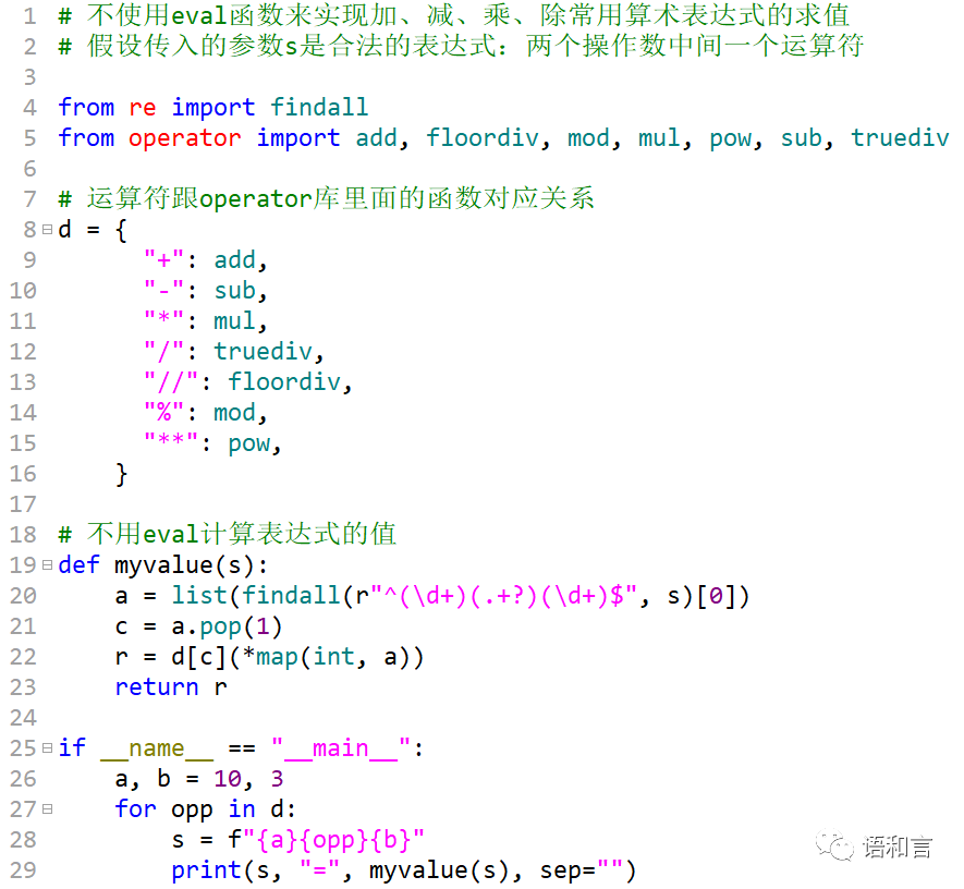 今天上数据结构课,讲二叉树应用的时候,提到了表达式求值的问题。我们可以做到既不使用eval函数,又不使用if语句来求算术表达式的值。为简单起见,我们不构建二叉树,只是介绍一下对于一个包含两个操作数和一个运算符的简单算术表达式进行求值的Python程序。环境:64位Win 10中文版 + 64位Python 3.6.5