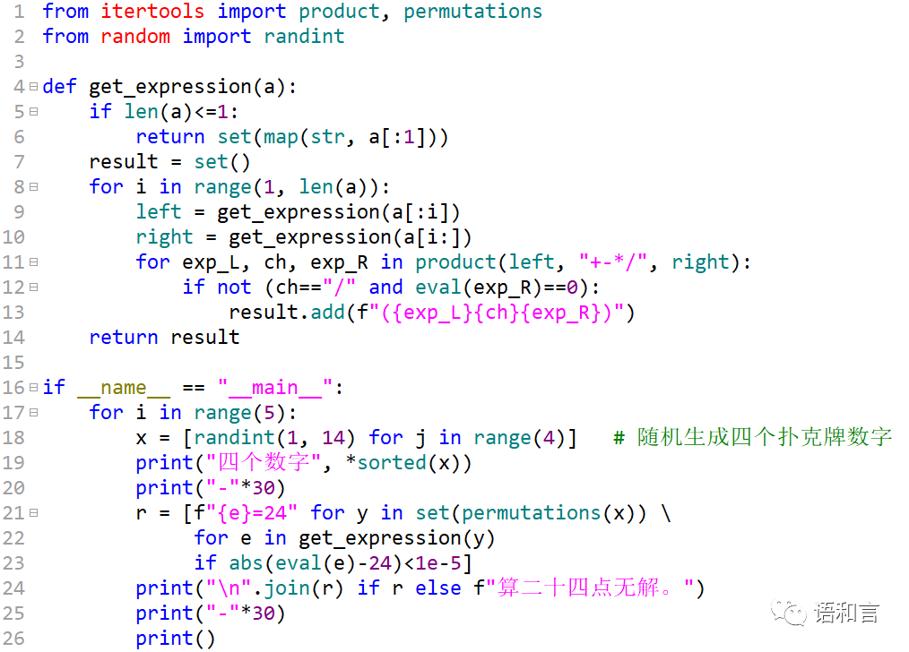 下面就编写一个Python递归程序,接收随机产生的四张扑克牌数字,输出让这几个数字计算得到24的所有表达式,如果没有,就输出这四个数字算二十四点无解的提示信息。