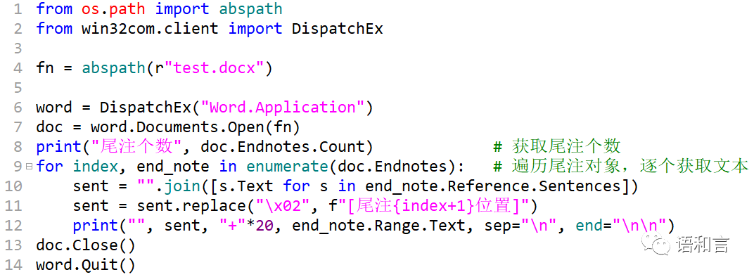 我们发现这段程序跟 《用pywin32完美提取Word文件中的脚注文本》 里面的程序非常像,是的,主要就是把 doc.Footnotes 改成了doc.Endnotes ,另外一些小的改动是:改了个循环变量的名字,输出的提示信息,注释信息。