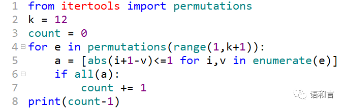 上面的程序中,用了几个内置函数:abs、all、enumerate、range,还用了一个来自标准库 itertools 的排列函数 permutations。