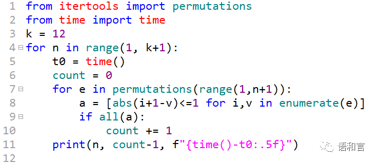 上面的程序中,用了几个内置函数:abs、all、enumerate、range,还用了一个来自标准库 itertools 的排列函数 permutations。