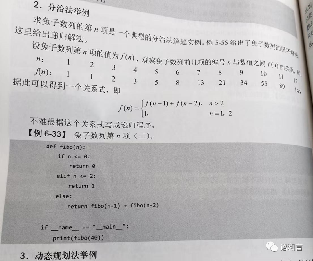 新书《Python程序设计(基于计算思维和新文科建设)》当中在介绍递归函数的时候提到过三种算法:减治法、分治法和动态规划法,感兴趣的读者朋友可以去阅读书中的相关章节。