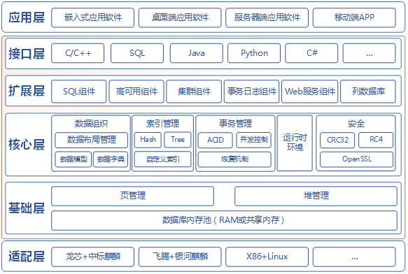 4) 扩展层:基于数据库内核,扩展出SQL组件、高可用HA组件、事务日志组件、Web服务组件、集群组件、列数据库等增强组件。