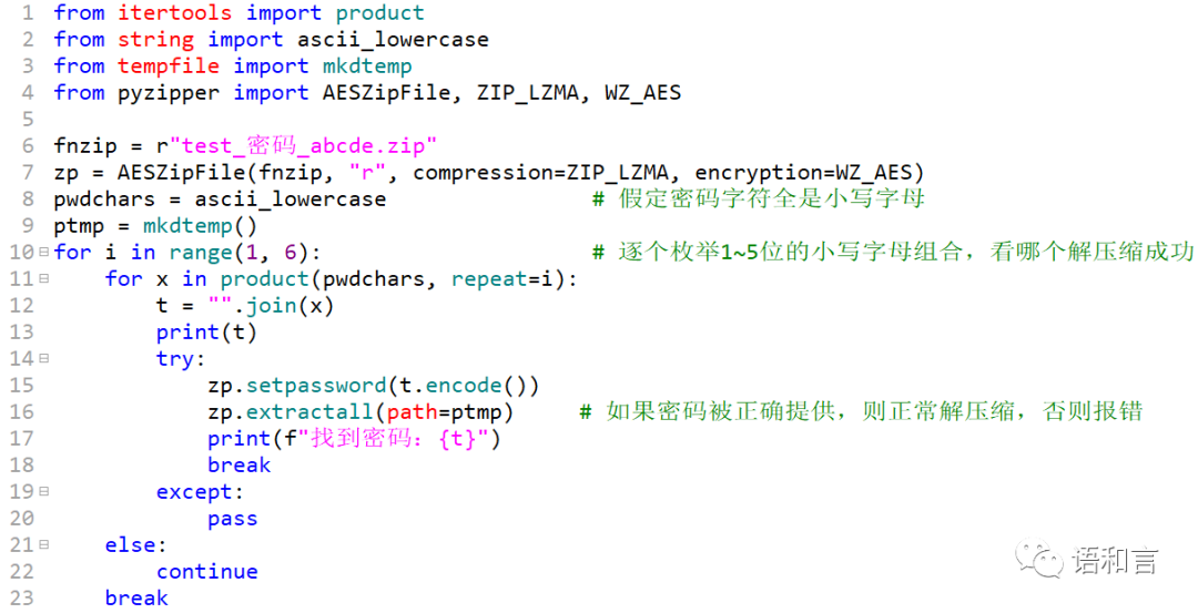 有的时候,我们需要把zip压缩包解压缩。对于不带密码的,操作比较简单,用zipfile库或pyzipper库打开zip文件,extractall就行。对于带密码的zip包,只要知道正确的密码就好办,extractall的时候提供一个pwd参数就行了。此前本号曾经写过解压缩zip文件的一些文章,感兴趣的同学和读者朋友可以参考。今天本号讨论的是:如果是忘了zip压缩包的密码怎么办呢?如果密码不太长的话,我们可以写个Python程序用枚举法把密码找出来。环境:64位Win 10中文版 + 64位Python 3.7.6