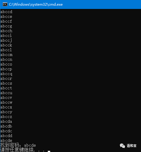 假设密码中的字符全部都是小写字母,且不超过5位。我们写个如下的程序就可以找到正确的密码abcde。