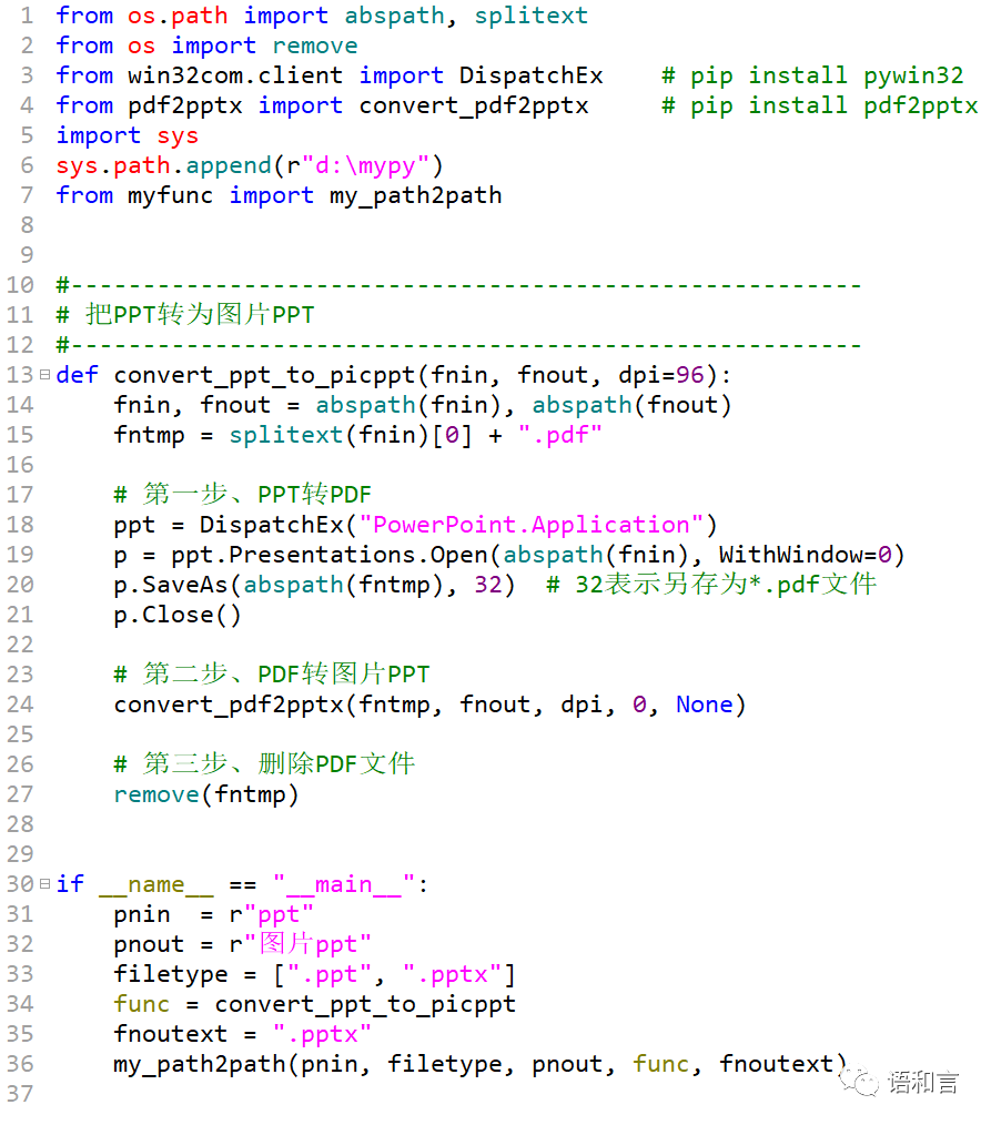 有的时候,我们需要把手头的文字版PPT文件转成图片版的PPT文件,用pywin32 和 pdf2pptx 这两个扩展库配合可以轻松做到这一点。不过,转换单个文件意思不大。本号今天分享把PPT文件批量转换成图片PPT文件的方法。