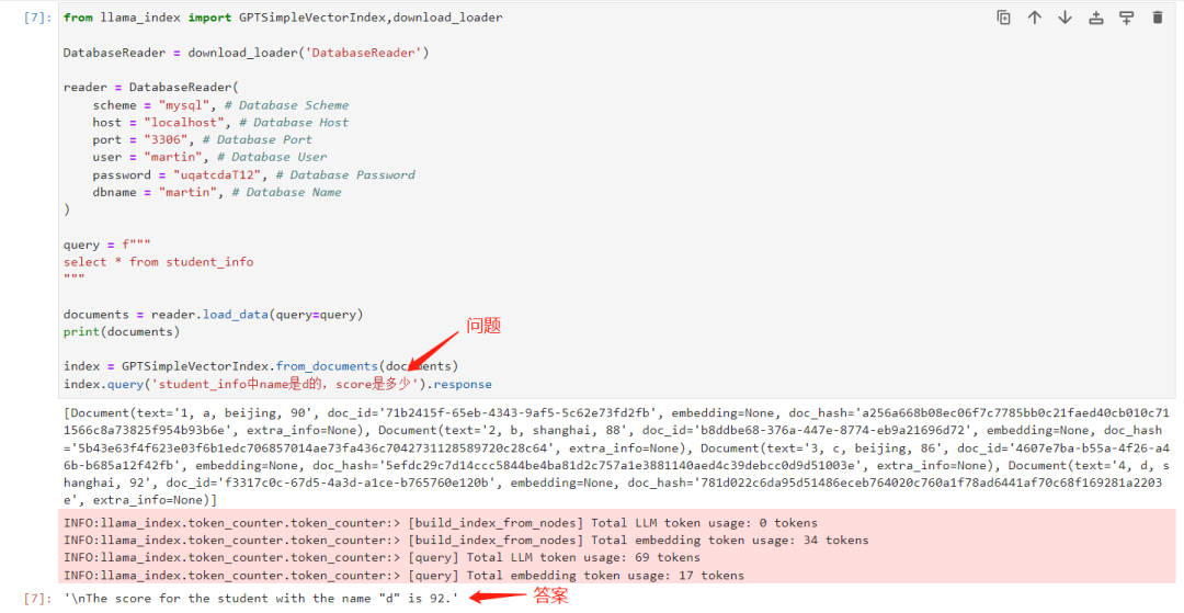 from llama_index import GPTSimpleVectorIndex,download_loaderDatabaseReader = download_loader('DatabaseReader')reader = DatabaseReader(scheme = "mysql", # Database Schemehost = "localhost", # Database Hostport = "3306", # Database Portuser = "martin", # Database Userpassword = "uqatcdaT12", # Database Passworddbname = "martin", # Database Name)query = f"""select * from student_info"""documents = reader.load_data(query=query)print(documents)index = GPTSimpleVectorIndex.from_documents(documents)index.query('student_info中name是d的,score是多少').response