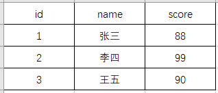 mysql> select * from student_score;+----+--------+-------+| id | name | score |+----+--------+-------+| 1 | 张三 | 88 || 2 | 李四 | 99 || 3 | 王五 | 90 |+----+--------+-------+3 rows in set (0.00 sec)